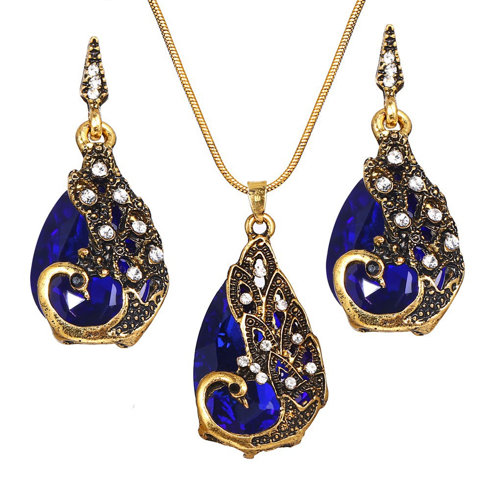 Vintage Peacock Jewelry Sets Woman Pendant Necklaces Water Drop Earrings Gift