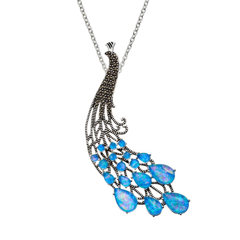 Simulated Opal Marcasite Silver Plated Peacock Pendant Necklace