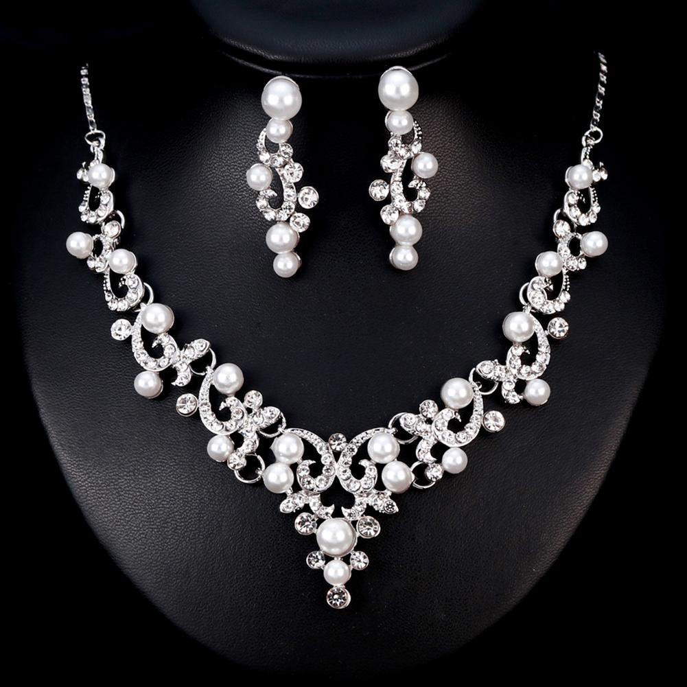 Fashion Alloy Rhinestone Faux Pearl Necklace Earrings Women Bride Jewelry Set